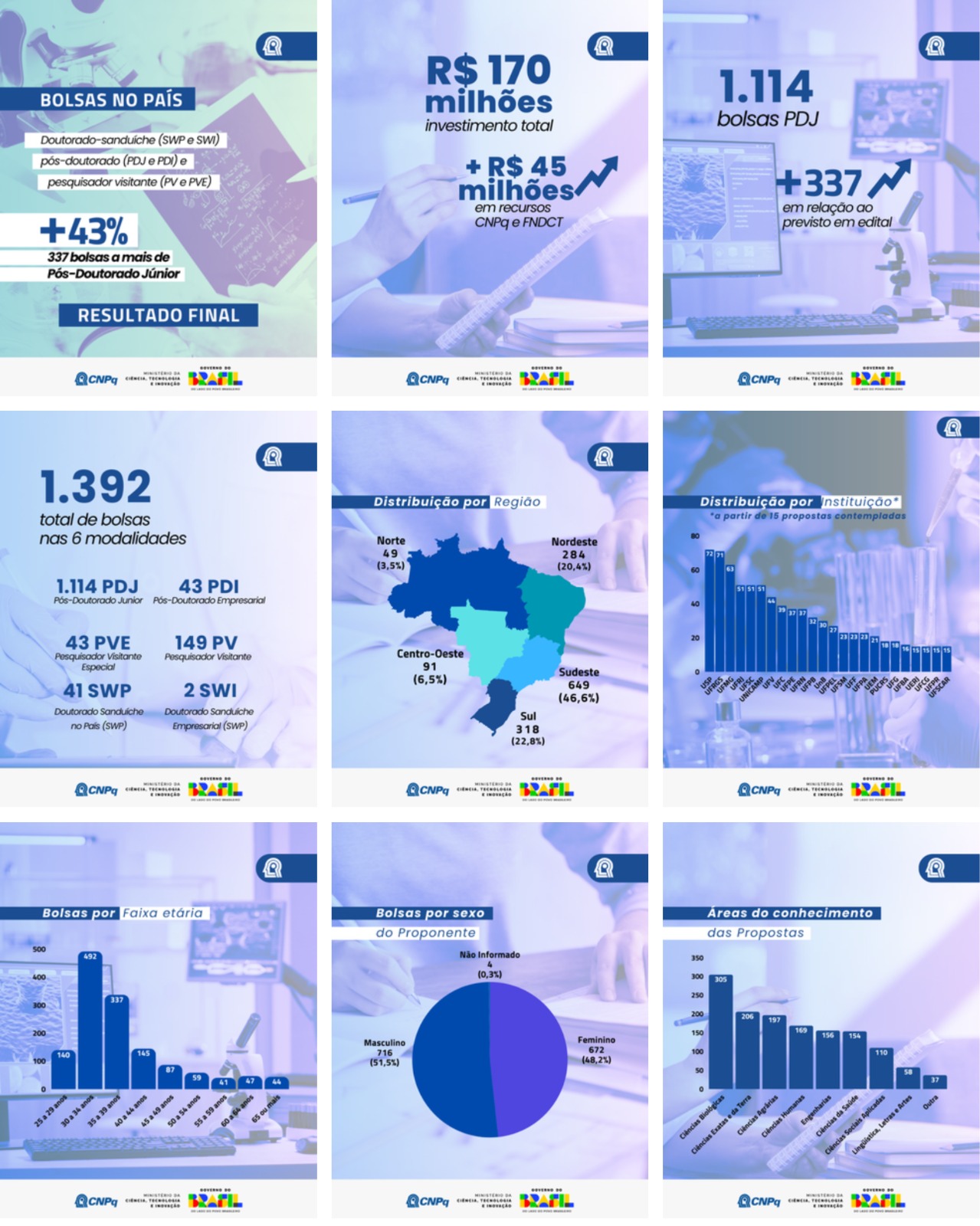 A distribuição das bolsas por faixa etária indica que jovens pesquisadores foram os mais contemplados pela chamada, com 70% das bolsas (969) atribuídas a cientistas com menos de 40 anos. A faixa etária mais contemplada foi entre 30 e 34 anos, com 492 bolsas, 35,3% do total. Outras 337 bolsas (24,2%) foram para pesquisadores com entre 35 e 39 anos; e 140 (10%) para cientistas com idade entre 25 e 29 anos. No recorte por sexo dos proponentes, 467 (51,5%) são homens e 437 (48,2%) são mulheres, com 4 propostas (0,3%) sem declaração.