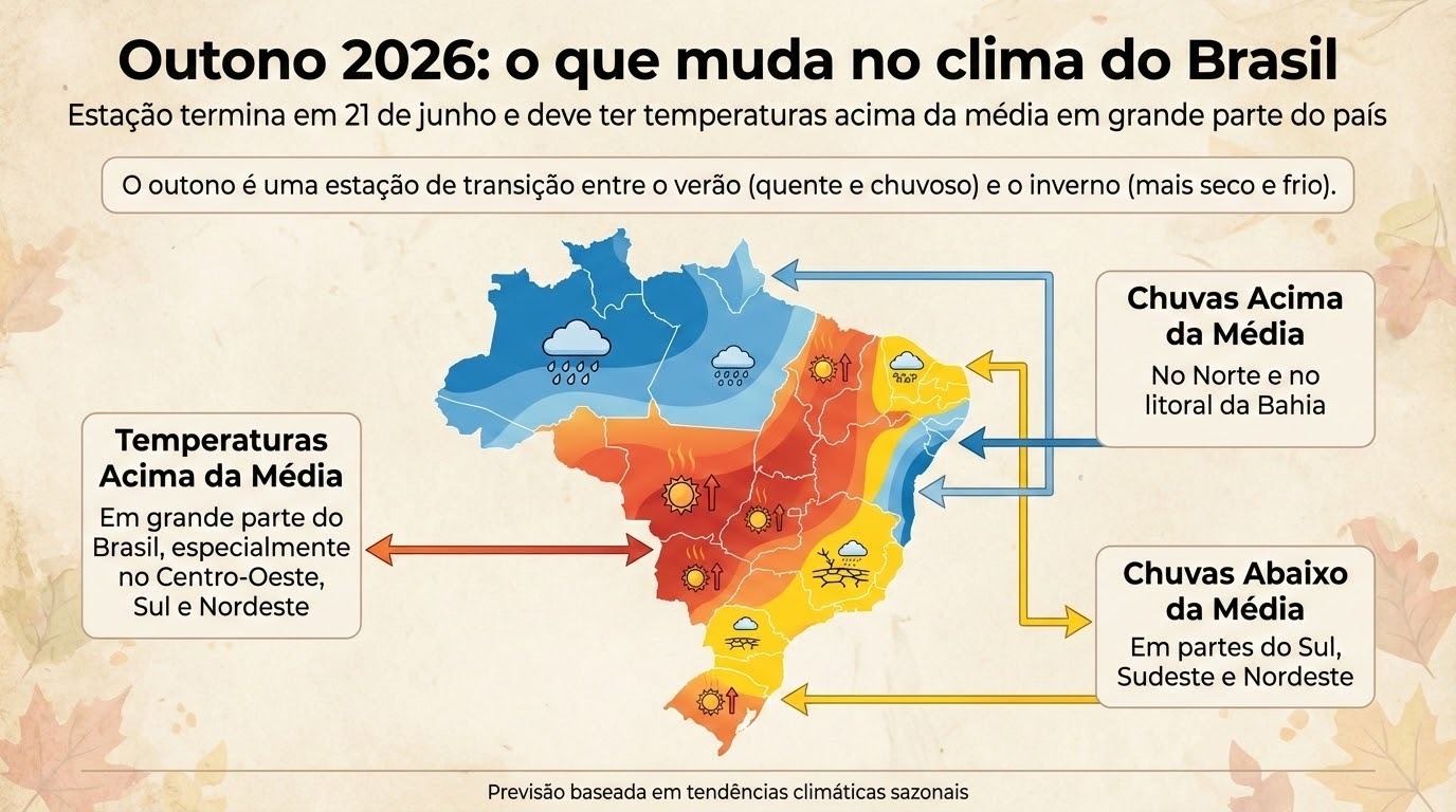 O verão brasileiro se despediu nesta sexta-feira (20), às 11h46, e abriu espaço para o outono no hemisfério sul. A estação, que se estende até 21 de junho, tende a vir com temperaturas acima da média em grande parte do País, principalmente nas regiões Sul, Centro-Oeste e Nordeste, além de áreas do Sudeste e da Região Norte.