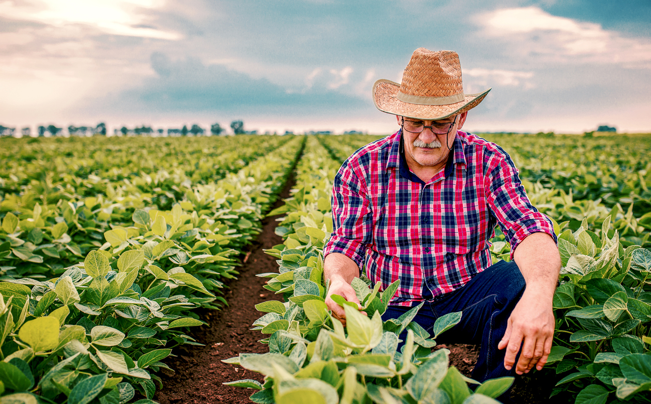 Farmer checking crop in a soybean field . Agricultural concept