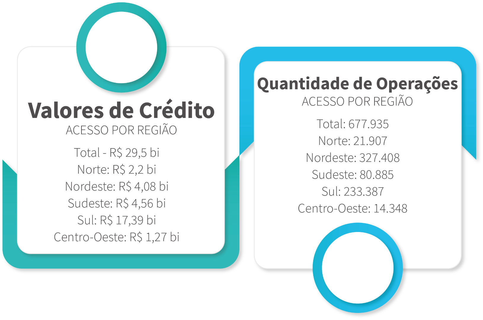 As regiões no Brasil que mais acessaram o crédito rural do Pronaf, no atual Plano Safra, por quantidade de operações, foram o Nordeste, com 48% das operações e o Sul, com 34%.
