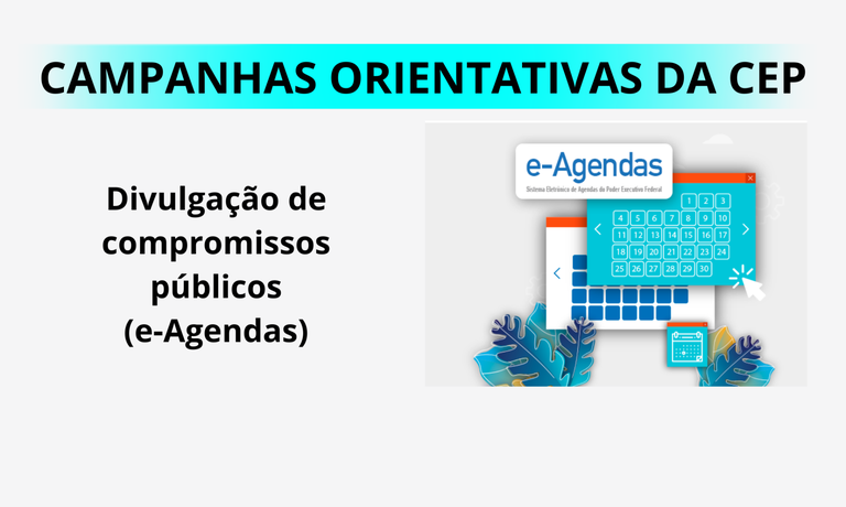 A Comissão de Ética Pública (CEP) inicia nesta quinta-feira, 16 de fevereiro, campanha de orientação aos integrantes da Alta Administração federal sobre suas obrigações e exigências do cargo em relação à transparência das agendas públicas, prevenção de conflito de interesses e preenchimento correto dos sistemas e-Agendas e e-Patri, desenvolvidos pela Controladoria-Geral da União (CGU) em atenção ao Decreto nº 10.889, de 9 de dezembro de 2021, e Decreto nº 10.571, de 9 de dezembro de 2020, respectivamente. A campanha será conduzida em parceria com a CGU, órgão responsável pelos mesmos temas, no seu âmbito de atuação.