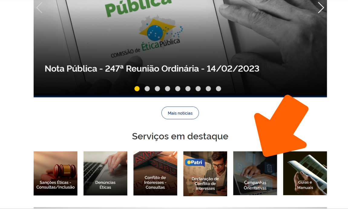 Ao longo de 2023, a CEP disponibilizará diversos materiais com orientações às altas autoridades da Administração Pública federal e aos integrantes do Sistema de Gestão da Ética do Poder Executivo Federal, cumprindo seu papel de órgão central. Os folhetos e todo o material produzido ficarão disponíveis para download na página da CEP (acesse aqui). O acesso também pode ser feito a partir da página principal da CEP, conforme imagem abaixo: