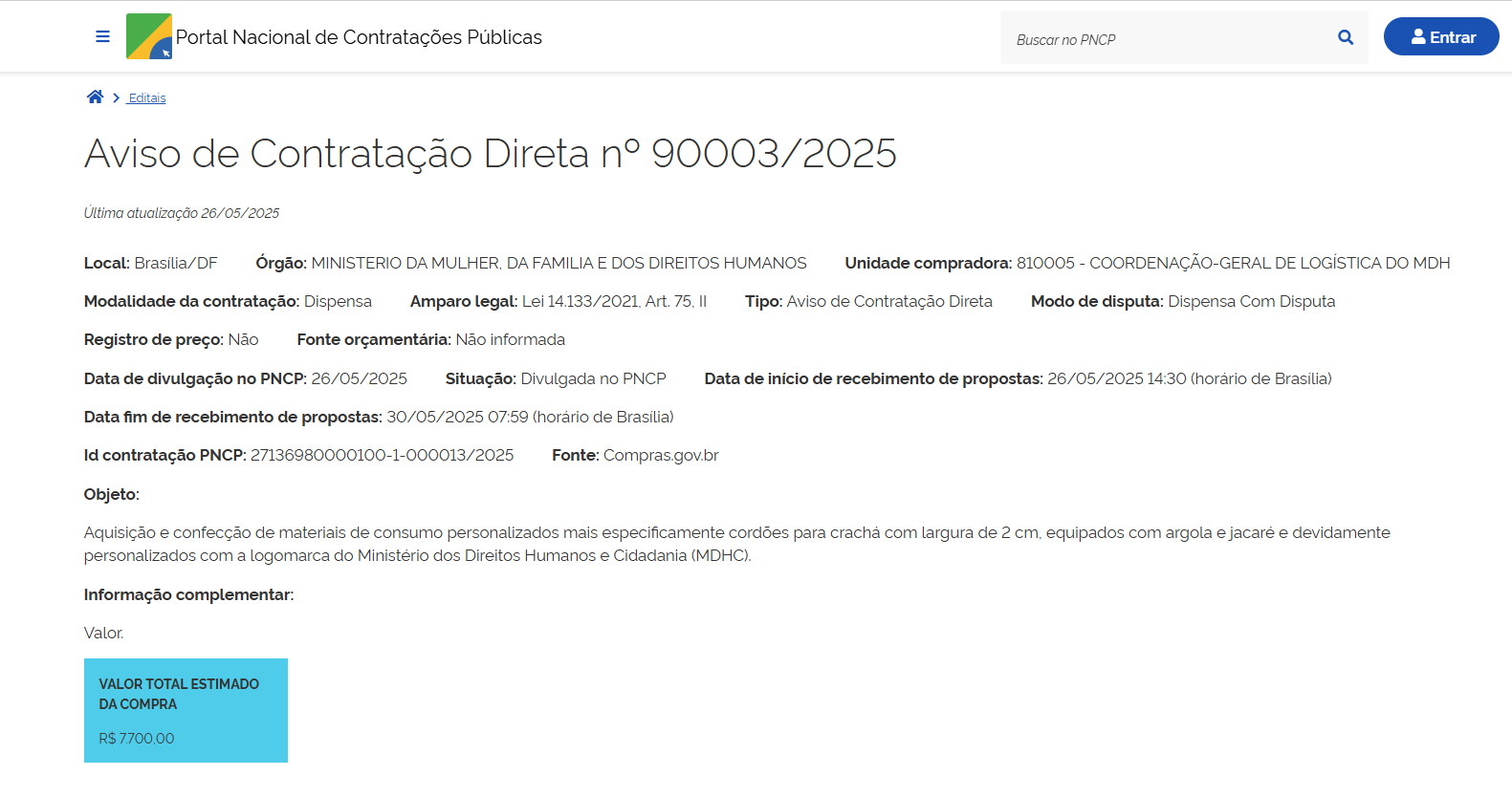 Dispensa Eletrônica nº 90003/2025 - Aquisição e confecção de materiais de consumo personalizados mais especificamente cordões para crachá com largura de 2 cm, equipados com argola e jacaré e devidamente personalizados com a logomarca do Ministério dos Direitos Humanos e Cidadania.