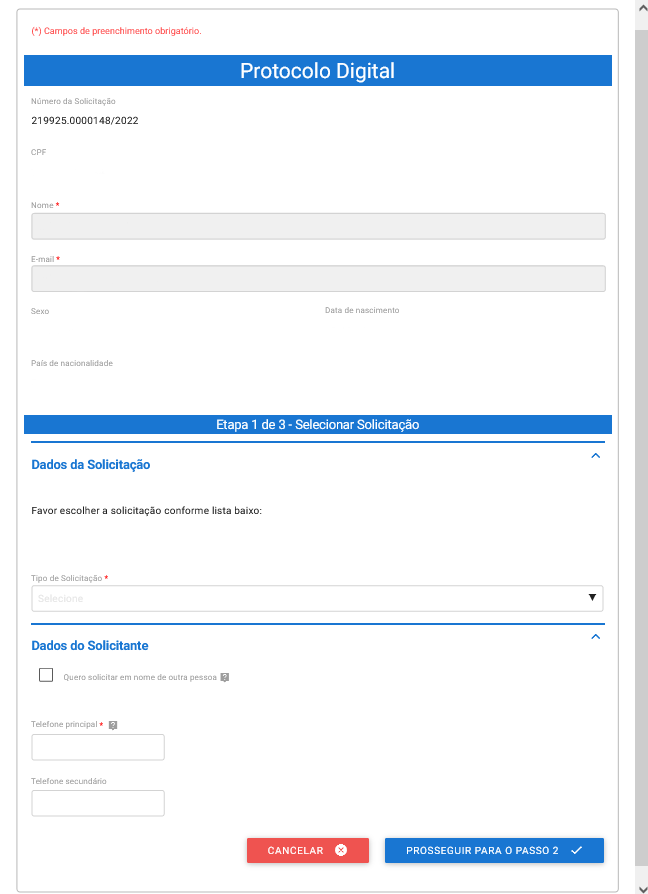 Protocolo Digital – Etapa 1 de 3 – Selecionar Solicitação
