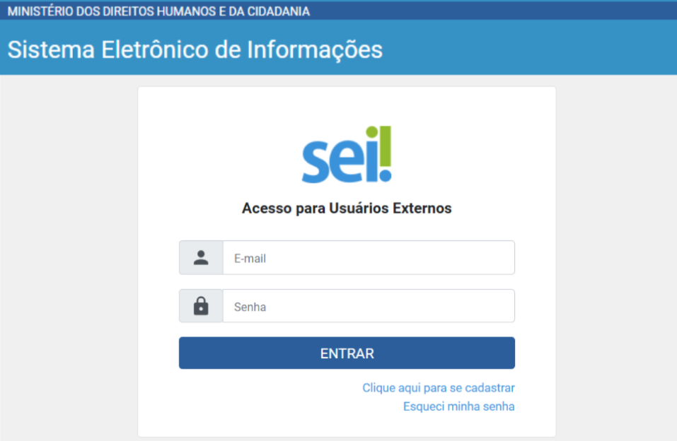 O SEI Externo disponibiliza cadastro para usuários externos, destinado a pessoas físicas, participar em processos administrativos junto ao Ministério dos Direitos Humanos e da Cidadania (MDHC), independente de vinculação a determinada pessoa jurídica, para fins de: