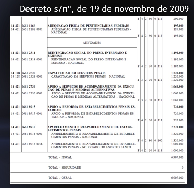 O orçamento, de acordo com a publicação, serviria para construção da quinta penitenciária federal, adequação física de penitenciárias federais, reintegração de presos, internados e egressos, capacitação em serviços penais, reaparelhamento de unidades penais e acompanhamento à execução de penas alternativas, além de outras destinações.