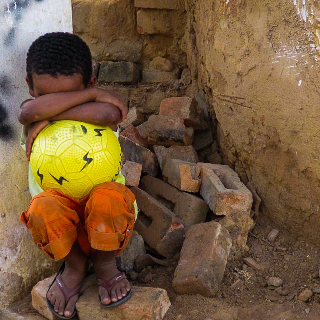 Descrição: "Entre o sonho de ser um grande atleta e os campinhos de chão do interior da Bahia, meninos brincam sob o sol que os queima, se sujam e se marcam da poeira que predomina no sertão da Bahia. Marcas de barro vermelho que suja suas roupas e sua pele. Entre o sonho de ser uma grande estrela de futebol e a timidez diante de uma câmera de uma curiosa fotógrafa. Menino esconde-se com as mãos, entrelaçando a bola amarela, mostrando no cantinho de parede a sua realidade social, a sua realidade que talvez nunca chegue a ser aquela que sempre sonhou. A de ser um jogador de futebol."