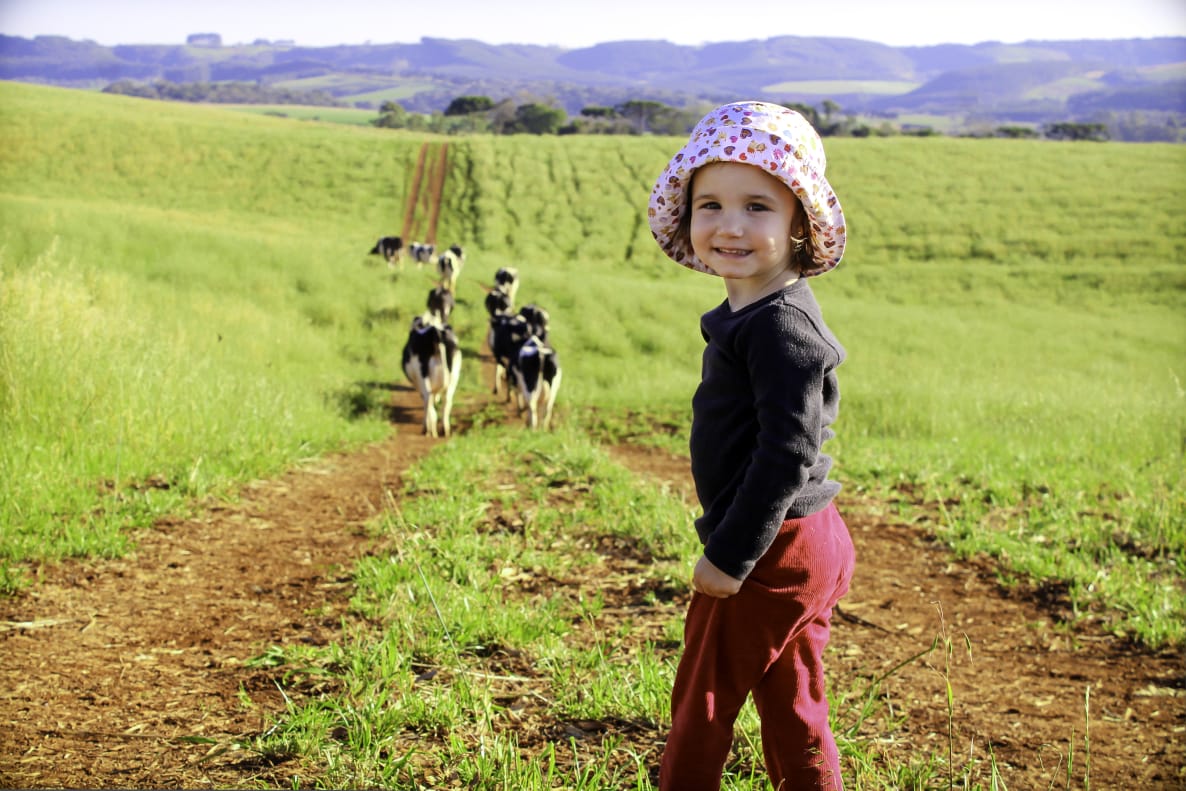 Descrição: "Essa foto representa a paixão da minha família pela terra e pelo trabalho, que gera o nosso sustento. A criança é a Helena, de dois anos e meio, apaixonada pelo gado leiteiro. Uma das principais fontes de renda no Sul do país, principalmente nas pequenas propriedades familiares.”