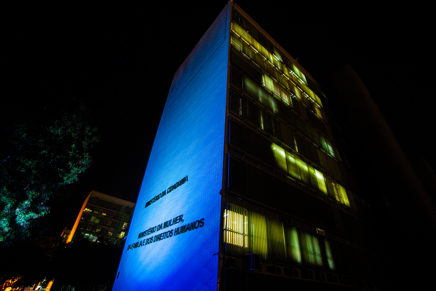 Ministério está iluminado de azul para celebrar a luta mundial contra o crime. Casos devem ser reportados ao Disque 100 e às forças de segurança pública (Foto: Hilton Silva – Ascom/MMFDH).