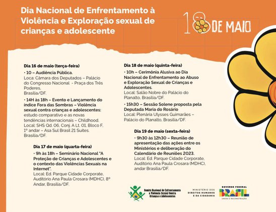 O Ministério dos Direitos Humanos e da Cidadania (MDHC), em parceria com o Pacto Global da Organização das Nações Unidas (ONU), a Childhood Brasil, a Rede Ecpat Brasil, o Freedom Fund , o Comitê Nacional de Enfrentamento à Violência Sexual contra Crianças e Adolescentes e o Instituto Alana, planeja uma série de ações ao Dia Nacional de Enfrentamento ao Abuso e à Exploração Sexual de Crianças e Adolescentes