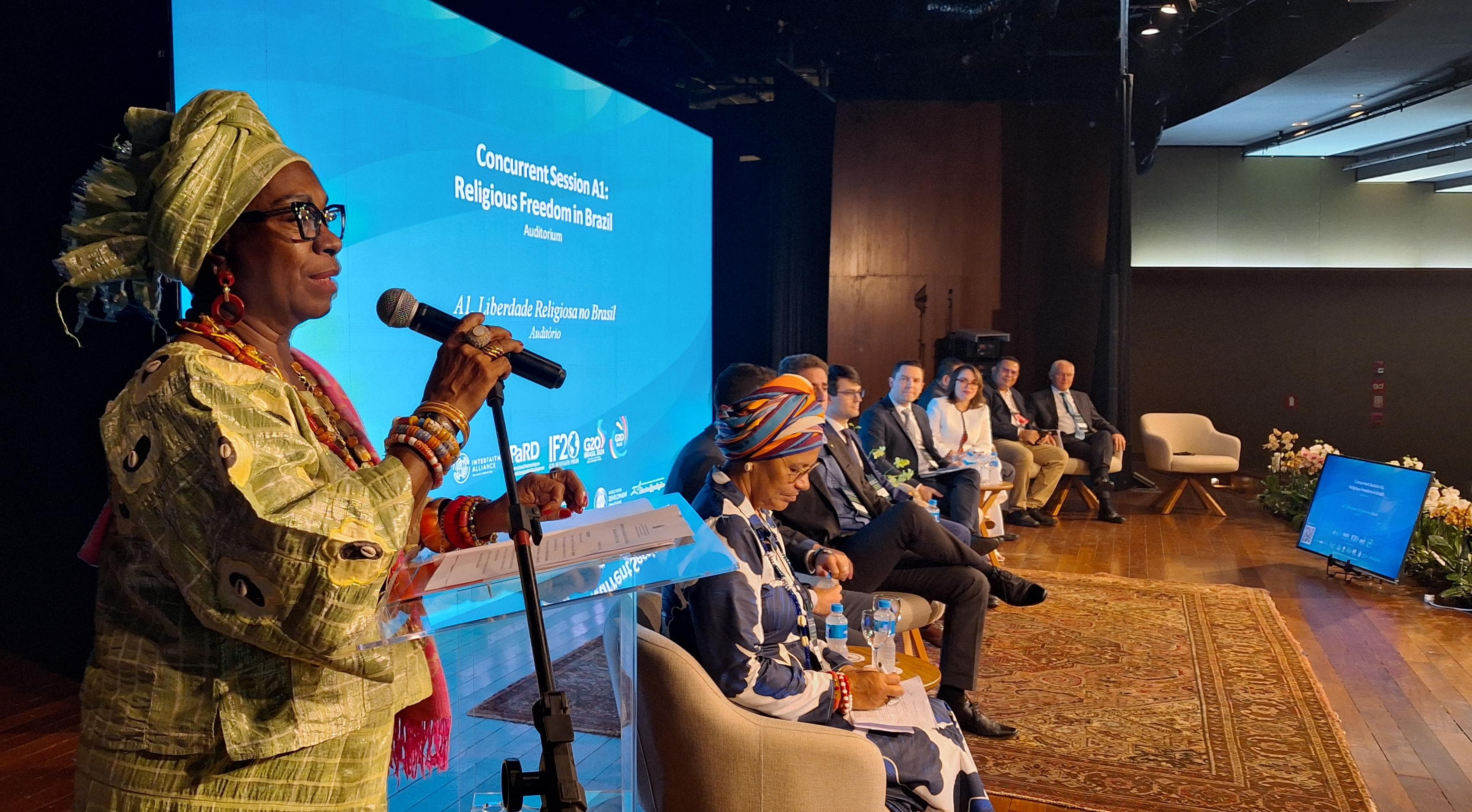 - A coordenadora-geral da Liberdade Religiosa, Iyá Gilda, destacou a urgência de ações colaborativas para enfrentar os desafios socioeconômicos e ambientais globais (Foto: Sonia Correa)