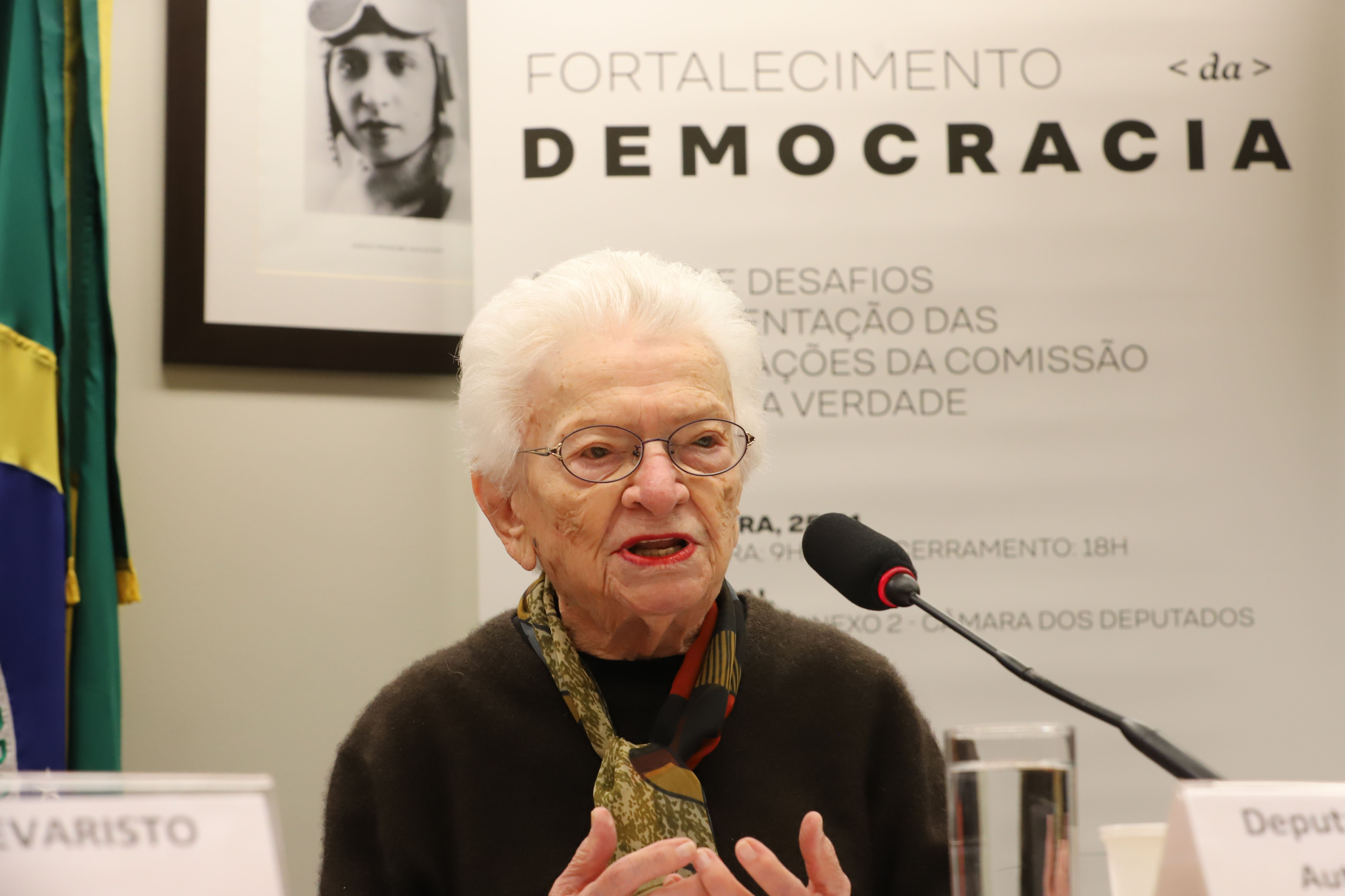 A ministra dos Direitos Humanos e da Cidadania, Macaé Evaristo, participou, nesta terça-feira (25), da mesa de abertura do seminário “Fortalecimento da Democracia: Avanços e desafios na implementação das Recomendações da Comissão Nacional da Verdade”, realizado na Câmara dos Deputados. A atividade foi solicitada pela deputada Luiza Erundina e contou com o apoio da Comissão de Direitos Humanos, Minorias e Igualdade Racial, e da Comissão de Legislação Participativa, em parceria com o Instituto Vladimir Herzog e a Defensoria Pública da União (DPU).