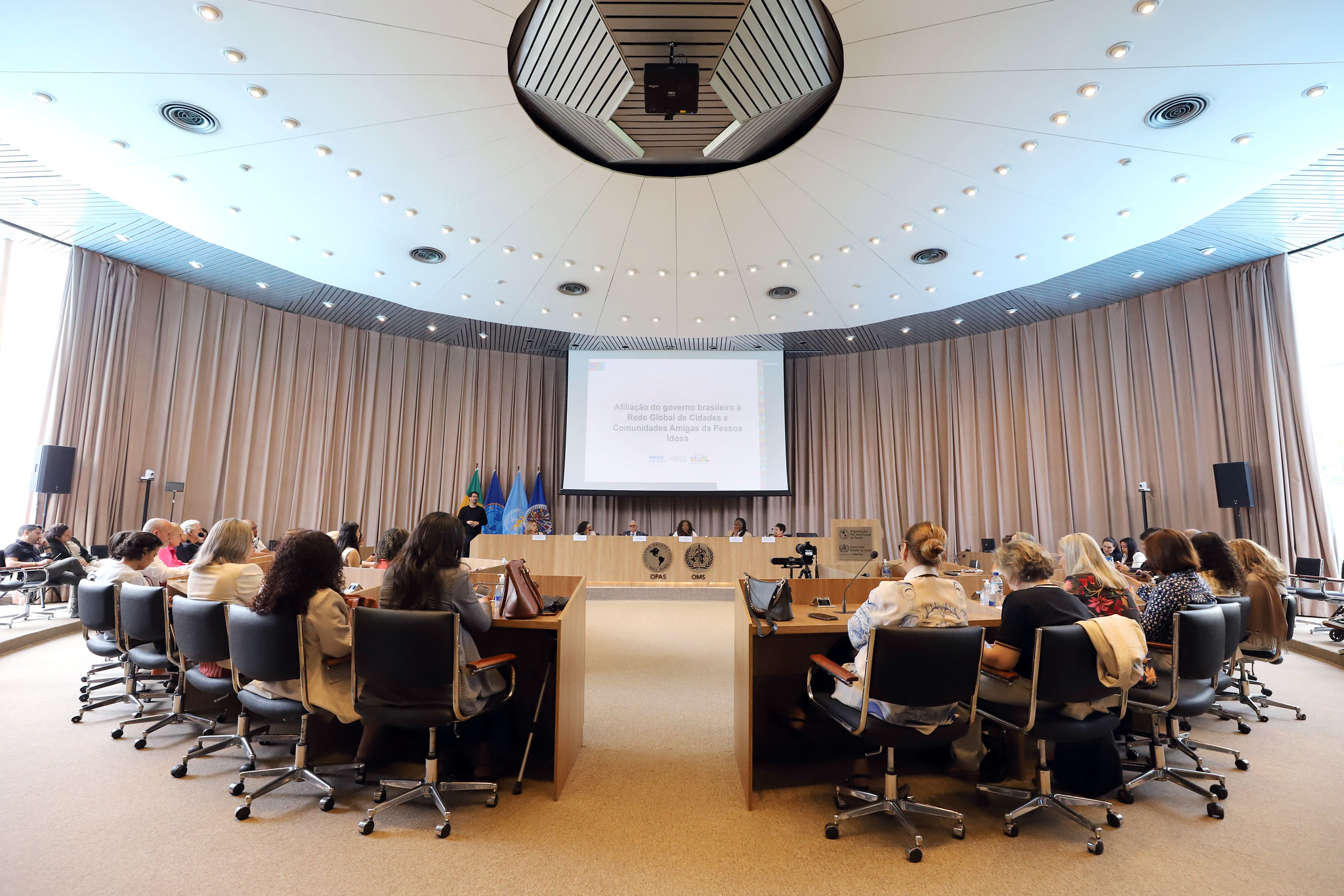 Além da ministra dos Direitos Humanos e da Cidadania, Macaé Evaristo, compuseram a mesa da cerimônia de afiliação: o secretário nacional dos Direitos da Pessoa Idosa, Alexandre da Silva; o representante da OPAS/OMS no Brasil, Cristian Morales, a representante do Conselho Nacional dos Direitos da Pessoa Idosa, Arilda de São Sabbas; a Diretora da Fundação Oswaldo Cruz - Fiocruz Brasília, Fabiana Damásio e a representante da Rede Nacional dos Gestores Estaduais e Distrital dos direitos humanos da pessoa idosa, Dolores Moreira. Também participaram virtualmente, o Coordenador da Rede Global de Cidades e Comunidades Amigas da Pessoa Idosa da Organização Mundial da Saúde (OMS), Thiago de Sá e o Diretor do Departamento de Sistemas e Serviços de Saúde da OPAS, James Fitzgerald.