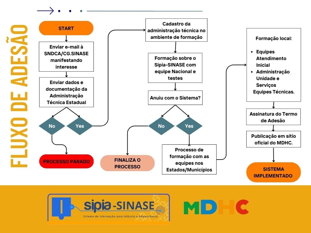 A adesão ao Sistema ocorre após articulação com a rede de atendimento socioeducativo local, seguida da assinatura do Termo de Adesão pelas autoridades responsáveis pela pasta de atendimento socioeducativo dos programas de atendimento, bem como pelo envio das documentações necessárias. O Termo de Adesão é enviado via SEI pelo MDHC/SNDCA. A seguir disponibilizamos o Fluxo para Adesão e para Assinatura do Termo de Adesão ao SIPIA-SINASE.