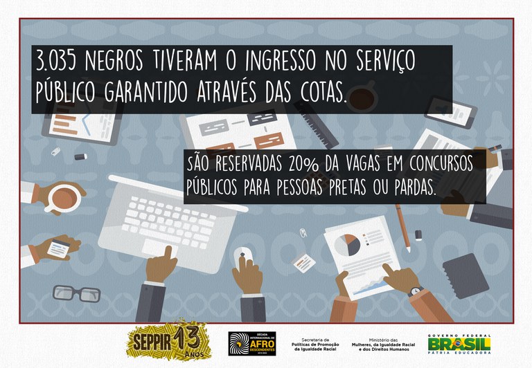 O monitoramento feito em editais de concursos públicos desde o início da vigência da Lei mostrou que 3.305 pretos e pardos tiveram o ingresso no serviço público garantido através das cotas (dados atualizados até dezembro/2015). A legislação, em vigor desde 9 de junho de 2014, prevê a reserva de 20% das vagas em concursos públicos federais para pessoas que se autodeclarem pretas ou pardas, utilizando a mesma metodologia do Instituto Brasileiro de Geografia e Estatística (IBGE).