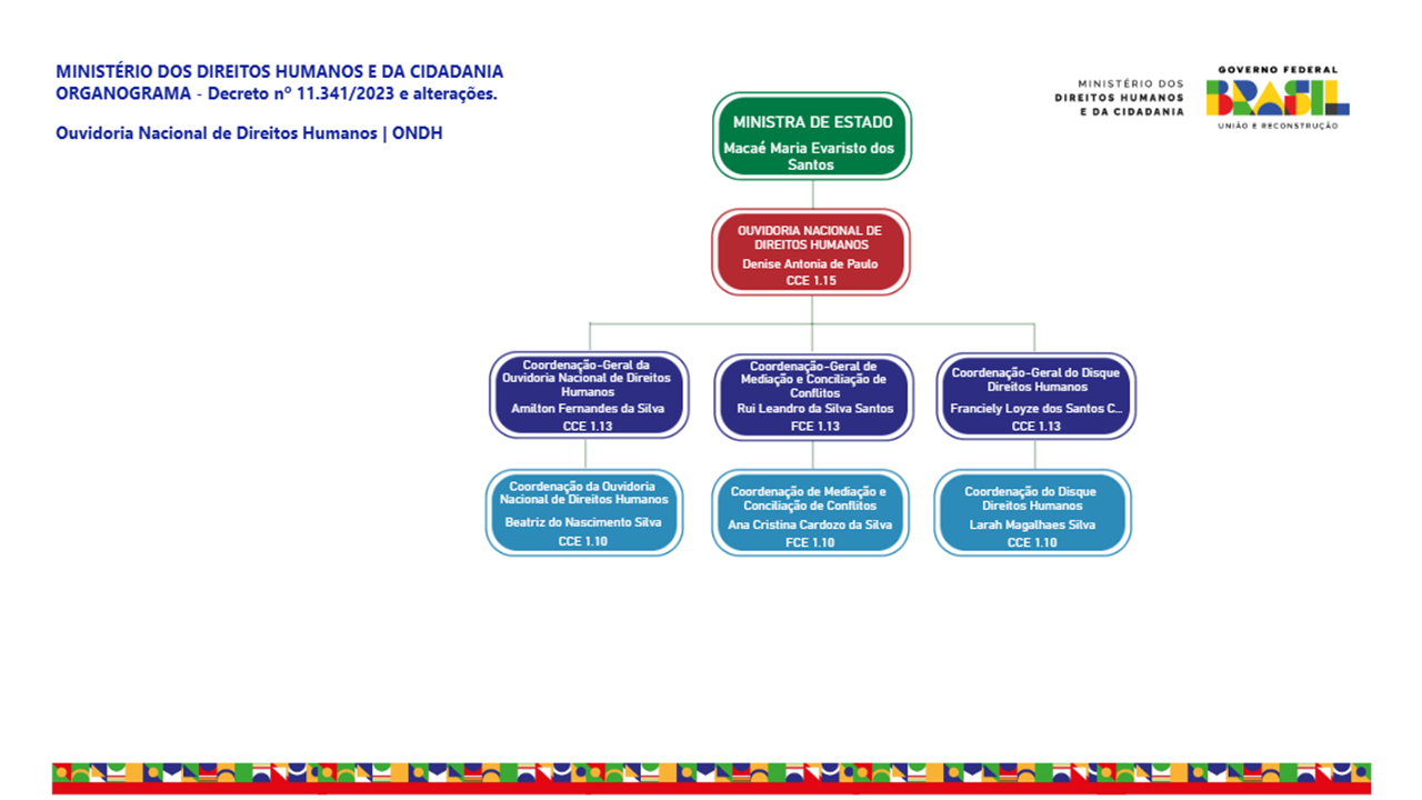 A Ouvidoria Nacional de Direitos Humanos (ONDH) atua como canal de comunicação da sociedade com o Ministério dos Direitos Humanos e da Cidadania (MDHC), com a missão de manter ferramentas acessíveis e permanentes entre a sociedade e os gestores públicos responsáveis pelas áreas.