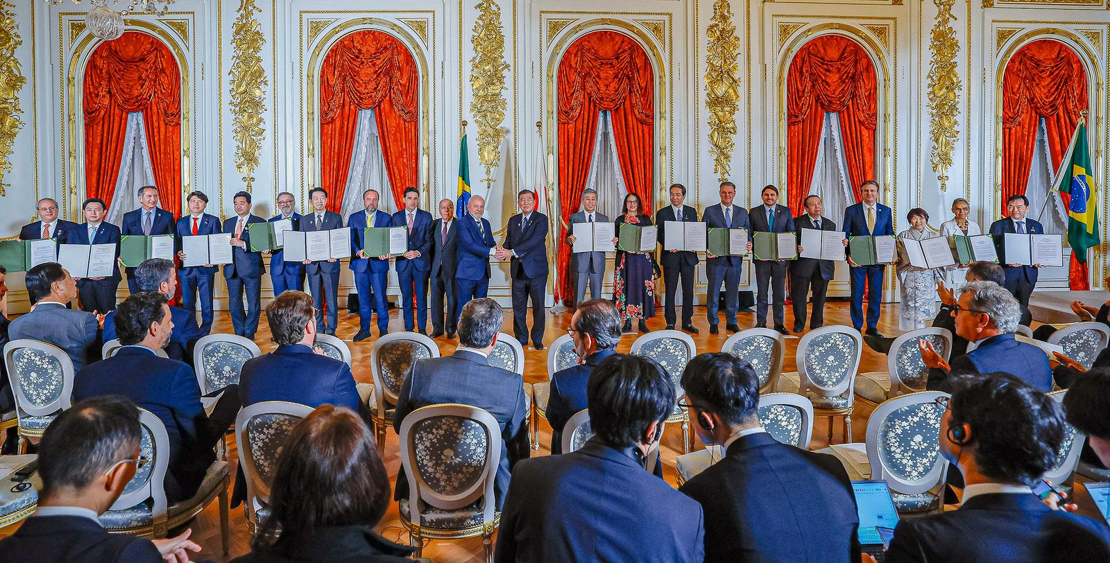 Presidente Lula e primeiro-ministro Shigeru Ishiba ao lado das comitivas de ministros e autoridades dos dois países que assinaram acordos de cooperação. Foto: Ricardo Stuckert