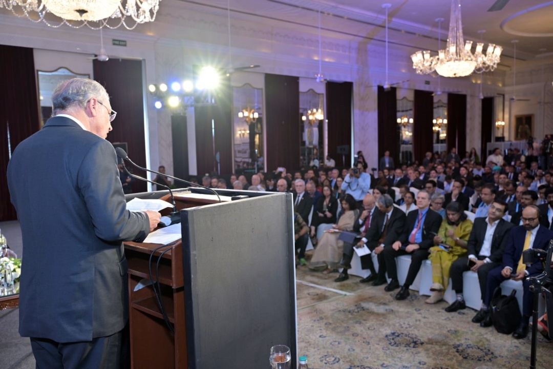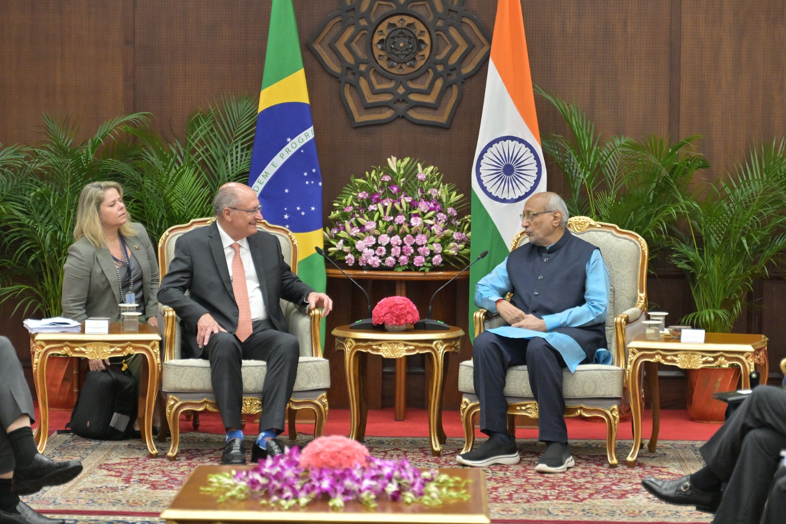 Marcelo Damasceno (comandante da Aeronáutica), José Múcio (ministro da Defesa), Kenneth Haczynski (embaixador do Brasil na Índia), o vice-presidente Geraldo Alckmin, Bosco da Costa Junior (presidente da Embraer Defesa & Segurança) e Shri Naidu (ministro da Aviação Civil da Índia): aposta na parceria. Foto: Virendra Singh / Secom / PR