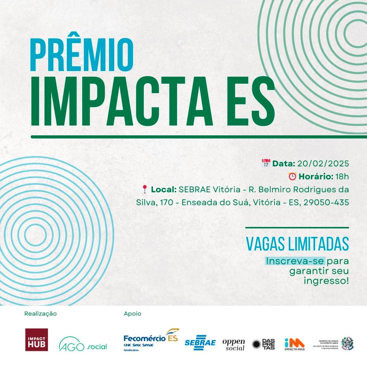 Esta é a primeira edição do Prêmio Impacta Espírito Santo, criado para valorizar os negócios de impacto socioambiental positivo no estado e consolidar o ecossistema econômico voltado à sustentabilidade e inovação social.