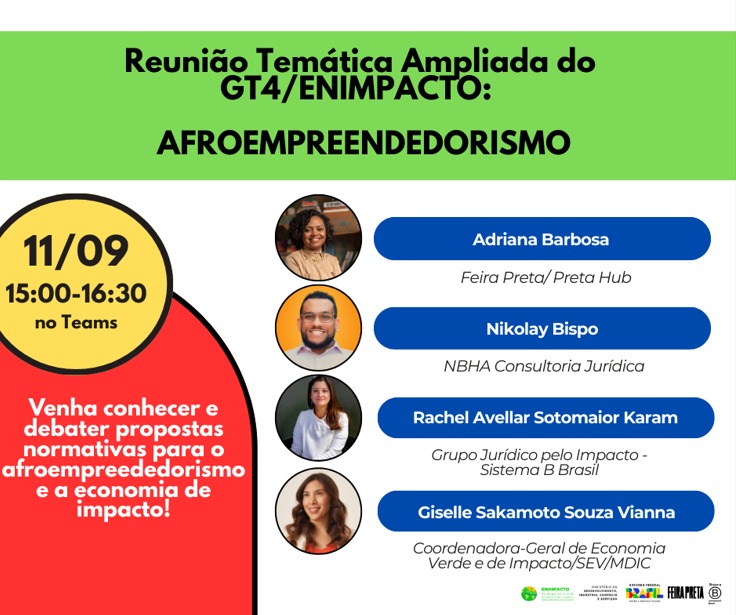 O Eixo Estratégico 4 da Enimpacto é direcionado à promoção de ambiente institucional e normativo favorável aos investimentos e negócios de impacto no país. Na reunião temática dia 11/09, o grupo de trabalho pretende oferecer um espaço de diálogo e construção coletiva para debater normativas que fortaleçam o Afroempreendedorismo e a economia de impacto no Brasil.