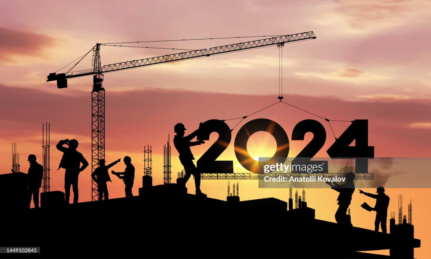 Concept New Year 2024 for marking, construction plans. Developer. Future planning and goals. Silhouette of a construction crane at a construction site raising the number 2024 year. Realistic vector.