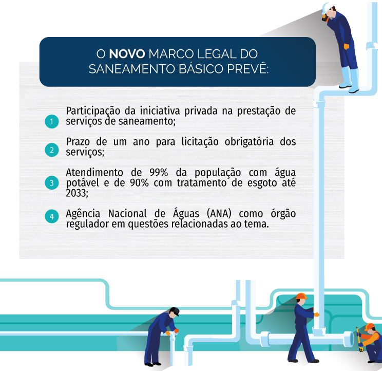 O relatório aprovado possibilita a entrada da iniciativa privada na prestação de serviços de saneamento e fixa o prazo de um ano para licitação obrigatória dos serviços. Nesse período, as empresas estatais de água e esgoto poderão renovar os contratos vigentes firmados com os municípios sem licitação, por até 30 anos. Porém, novos contratos desse tipo não poderão ser firmados a partir da aprovação da lei.