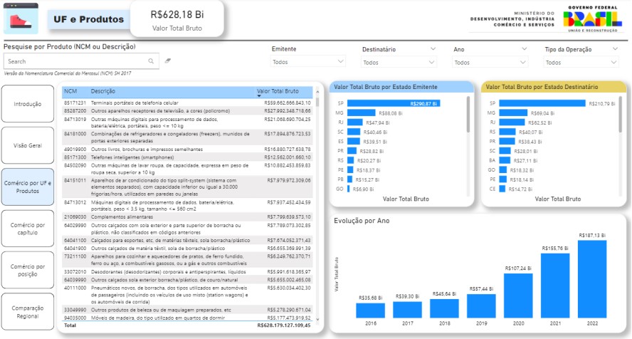 15. O que mostra a aba “Comércio por UF e Produtos” do dashboard