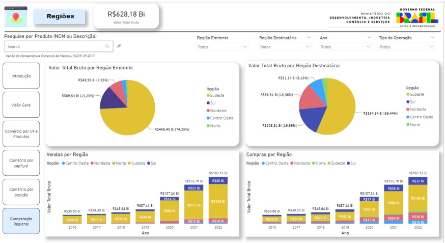 A aba “Comparação Regional” mostra as transações consolidadas pelas 5 regiões brasileiras. É possível, por exemplo, verificar que 74% das transações de e-commerce do período de 2016 a 2022 tiveram como emissores os estados do Sudeste.