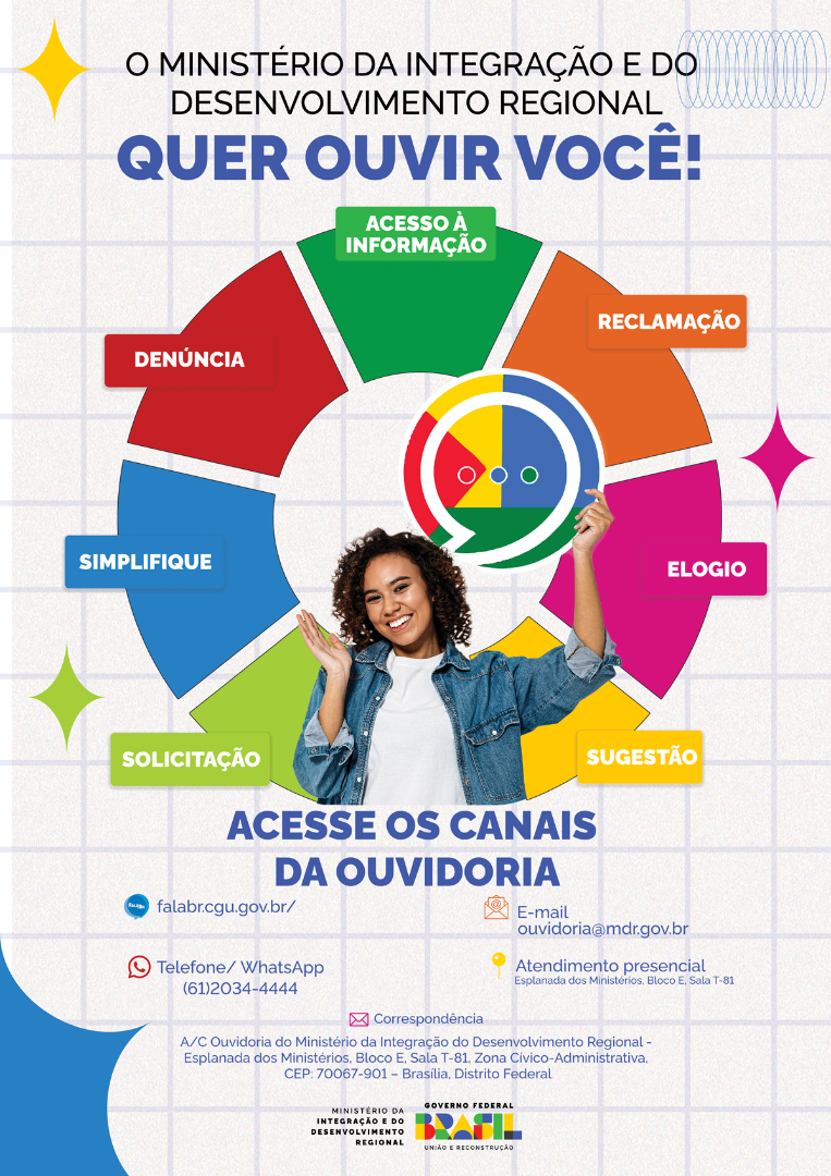 A Ouvidoria é o seu canal de comunicação com o Ministério da Integração e do Desenvolvimento Regional.   A sua participação é fundamental para a melhoria contínua dos nossos serviços, a eficácia das nossas políticas públicas e o combate à corrupção.