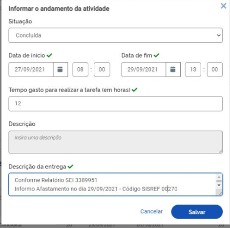 Durante as Férias/Atestados/Licenças/Afastamentos, o participante continuará com a rotina de cadastro e execução de Plano de Trabalho. Nos dias que estiver em algum desses afastamentos e/ou licenças, irá apenas informar no campo “Descrição da entrega” qual o período que estava ausente e o código do afastamento.