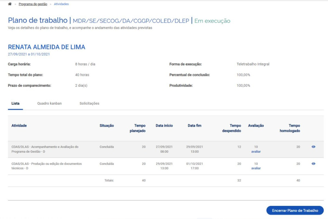 Logo, na conclusão das atividades do Plano de trabalho vai ficar assim: