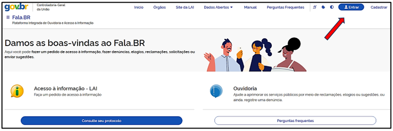 1) Na página inicial do Fala.BR (https://falabr.cgu.gov.br ), clicar em “Entrar”, no canto superior da tela