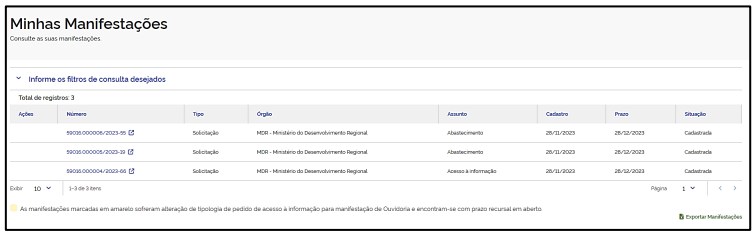 15) Será disponibilizado um painel com o número de protocolo de todas as manifestações feitas, o tipo de manifestação, assunto, data de cadastro, o prazo para conclusão e a situação ao qual se encontra no momento.