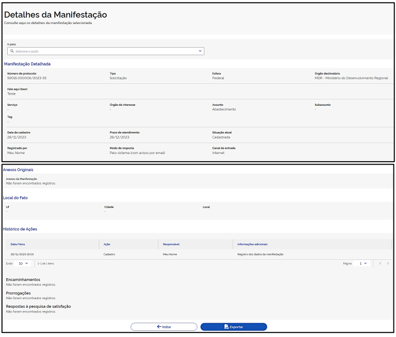 17) Na página o usuário é informado sobre os detalhes da manifestação, o que foi anexado originalmente, o local onde ocorreram os fatos e o histórico de ações feitas até o momento na manifestação.