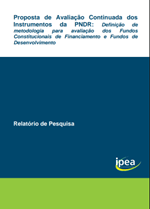 O relatório propõe uma avaliação contínua dos instrumentos da Política Nacional de Desenvolvimento Regional (PNDR). A ideia é sistematizar as avaliações que são feitas atualmente de forma separada, unindo esforços de avaliação já em andamento pelos bancos operadores. A DIRUR/IPEA seria responsável por coordenar e realizar as avaliações anuais propostas neste ciclo de avaliação discutido no relatório. |