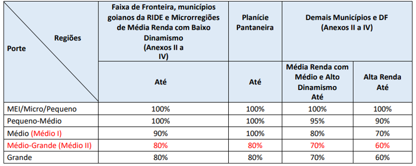 Podem variar de 60% a 100%, de acordo com porte/tipologia, finalidade e o espaço geográfico onde será instalado o empreendimento.
