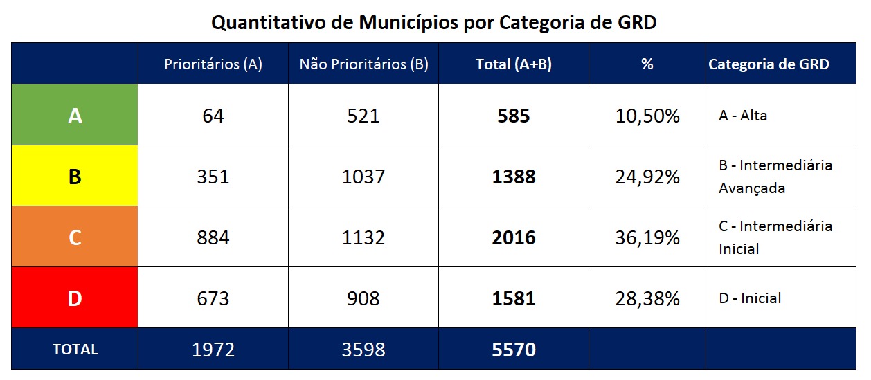 Estes números representam um grande desafio para todo o Sistema Nacional de Proteção e Defesa Civil (Sinpdec) já que 3.597 municípios (cerca de 64,58%) tem suas ações de gestão de riscos e de desastres em um estágio embrionário (inicial (D) e/ou intermediário Inicial (C). Nosso trabalho enquanto Sinpdec é fazer com que estes municípios migrem das faixas C e D para A e B.