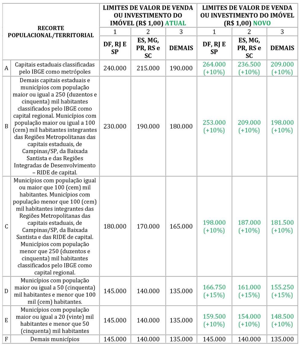 Outra medida aprovada é o aumento do valor máximo do imóvel a ser financiado por meio do Programa Casa Verde e Amarela. O reajuste varia de acordo com a região e o tamanho da população. Em municípios com 50 mil a 100 mil habitantes, o aumento do limite será de 15%. Entre 20 mil e 50 mil habitantes, de 10%. Já nos municípios com população menor que 20 mil habitantes, não houve alteração. Os demais municípios – incluindo as capitais e respectivas regiões metropolitanas – terão aumento de 10%.