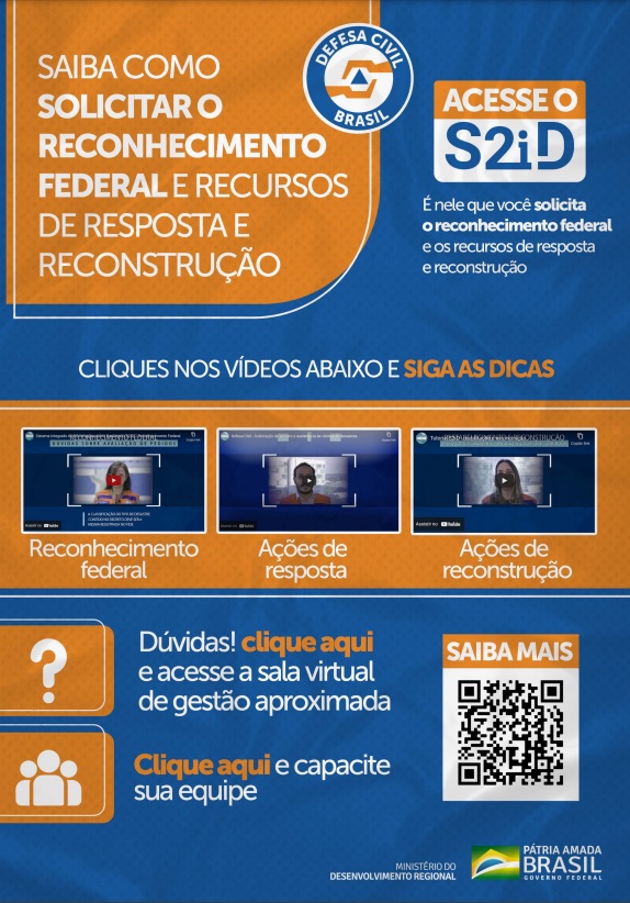 Para isso, é necessário que o município esteja cadastrado no Sistema Integrado de Informações sobre Desastres (S2iD). Na ferramenta, é possível elaborar Planos de Contingência; registrar desastres ocorridos no município/estado; solicitar o reconhecimento federal de situação de emergência ou de estado de calamidade pública; solicitar recursos federais a partir da elaboração de formulários on-line; consultar e acompanhar as solicitações de reconhecimento e de repasses para ações de resposta e de recuperação, e buscar informações sobre recorrências de desastres com base em dados oficiais. A plataforma pode ser acessada neste link . Vídeos com informações sobre o uso da S2iD podem ser acessados aqui .