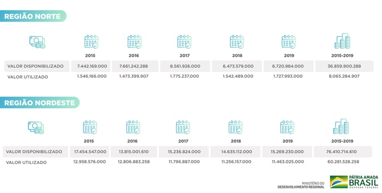 Segundo dados do MDR, de 2015 a 2020, foram disponibilizados R$ 36,8 bilhões pelo Governo Federal para financiamento habitacional popular na região Norte, mas apenas R$ 8 bilhões foram utilizados. Já no Nordeste, dos R$ 76,4 bilhões previstos, R$ 60,3 bilhões foram contratados. Devido à baixa demanda, os recursos foram remanejados para outras regiões do País. Confira na tabela abaixo os valores ano a ano.