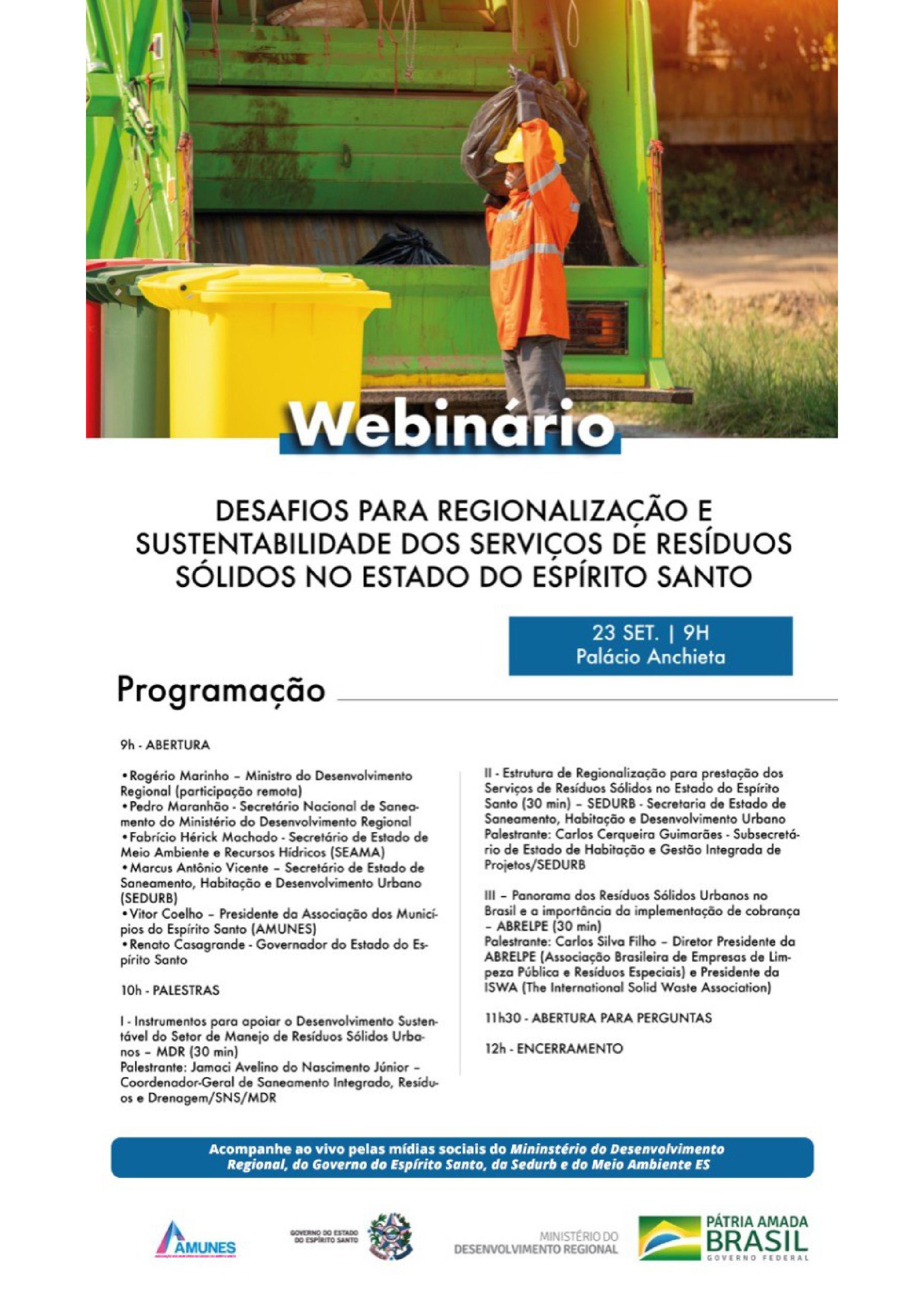 Brasília (DF) – O Governo Federal, por meio do Ministério do Desenvolvimento Regional (MDR), promove, nesta quinta-feira (23), o webinar Desafios para Regionalização e Sustentabilidade dos Serviços de Resíduos Sólidos no Espírito Santo. O secretário nacional de Saneamento, Pedro Maranhão, participa do evento.