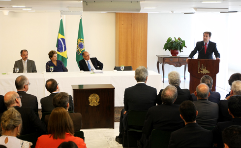 O ministro das Cidades, Gilberto Magalhães Occhi, e a presidenta Dilma Rousseff, participaram nesta quinta-feira (04/12), em Brasília (DF), da cerimônia de assinatura dos termos de compromisso para execução de obras de mobilidade urbana e saneamento básico no estado de São Paulo.