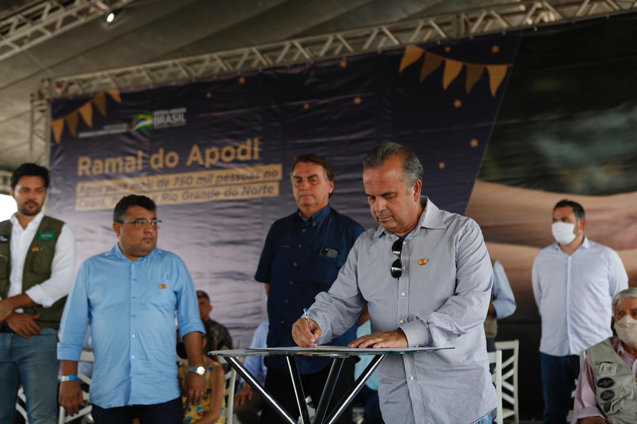 O Ramal do Apodi vai levar as águas do Rio São Francisco a 54 municípios nos estados do Rio Grande do Norte, Paraíba e Ceará, beneficiando 750 mil pessoas. Presidente Jair Bolsonaro e ministro Rogério Marinho assinaram Ordem de Serviço para início das obras (Foto: Dênio Simões/MDR)