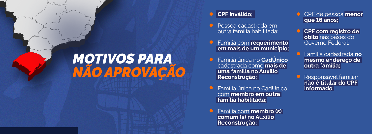 Ao fazer login no site do Auxílio Reconstrução, o responsável familiar receberá a informação de que o cadastro não foi aprovado e o motivo detalhado.