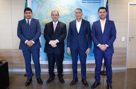 O ministro se reuniu, ainda, com o senador Omar Aziz (PSD/AM) (foto abaixo) , que estava acompanhado do prefeito de Parintins (AM), Frank Bi Garcia, e do deputado federal Saullo Vianna (UNIÃO/AM), para discutir assuntos relacionados ao estado do Amazonas e alinhar as ações relacionadas à construção de um muro de arrimo às margens do Rio Amazonas, no município de Parintins.