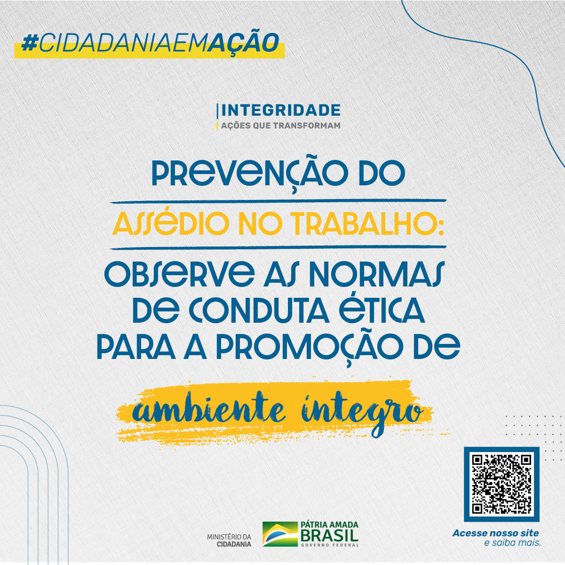 O Ministério da Cidadania espera que o ambiente de trabalho das equipes esteja de acordo com o disposto no Código de Conduta Ética, ou seja, um ambiente saudável e respeitoso, livre de ofensas, difamação, exploração, discriminação, repressão, intimidação, assédio e violência verbal ou não verbal.