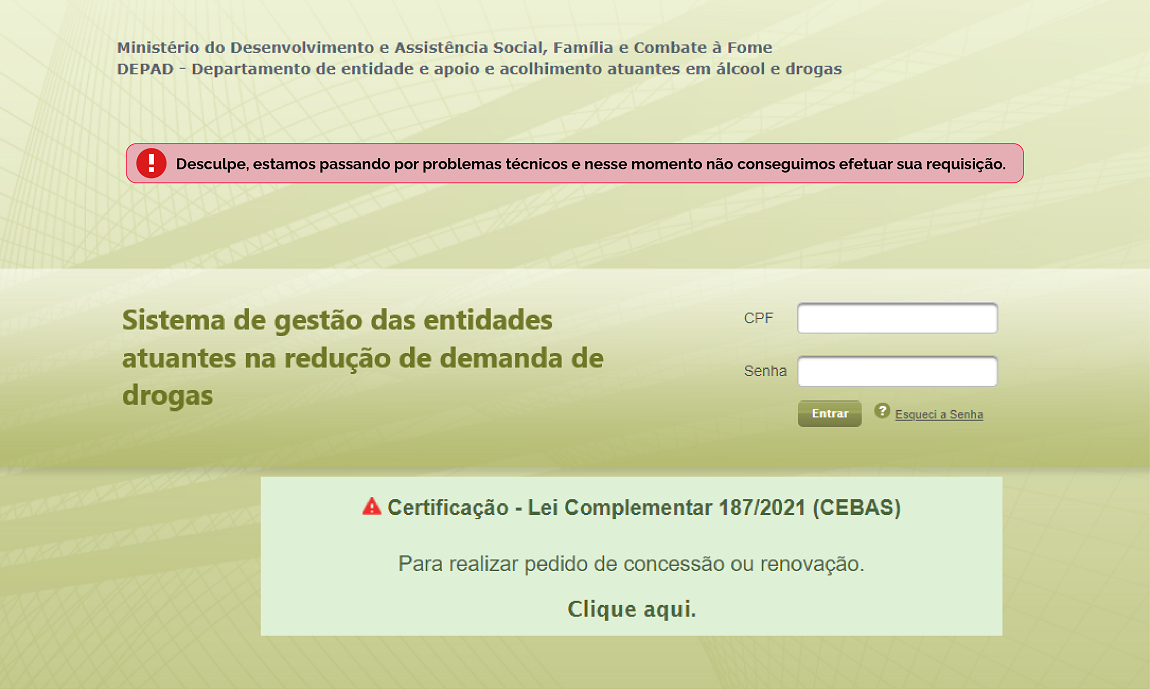 O Departamento de Entidades de Apoio e Acolhimento Atuantes em Álcool e Drogas, informa que durante os dias de 13 a 16 de setembro, o sistema de gestão das Entidades Atuantes na Redução de Demanda de Drogas (https://sisct.cidadania.gov.br/comunidades-web/public/login.jsf) ficou indisponível devido a questões técnicas.