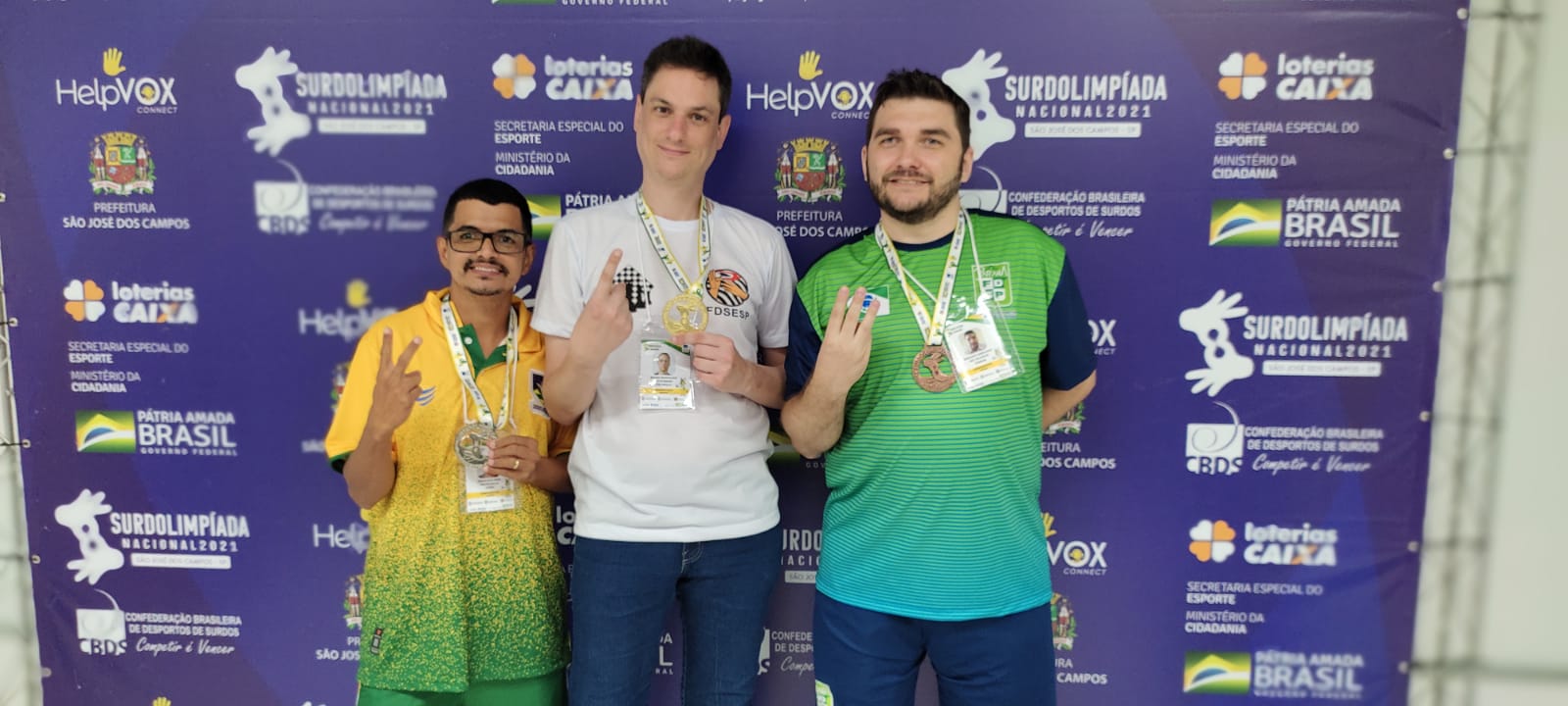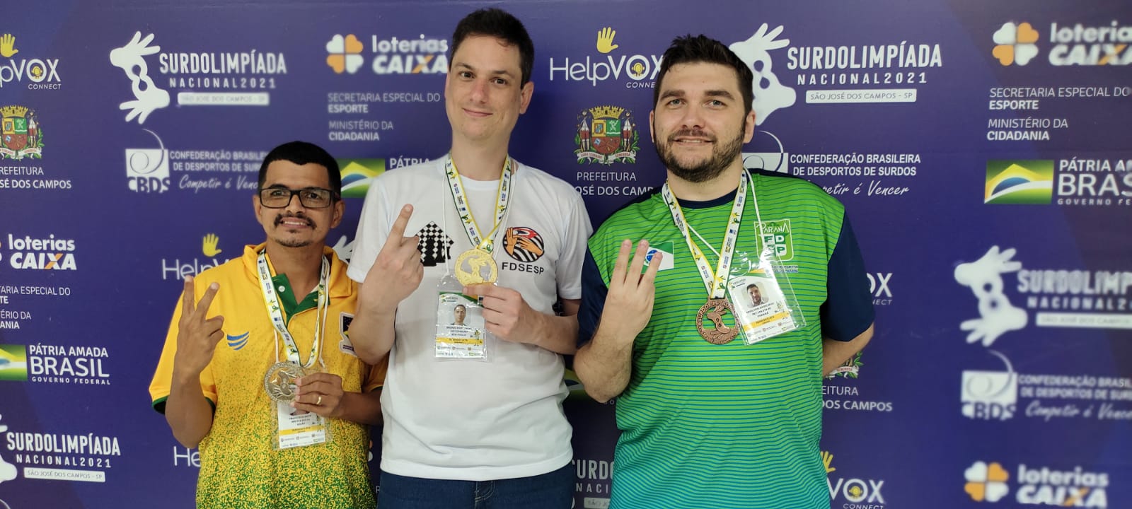 Pódio do masculino: o goiano Francisco Neto (E) com a prata, o paulista Bruno Montanha (SP) com o ouro e o paranaense Edielson Anselmini com o bronze. Foto: CBDS