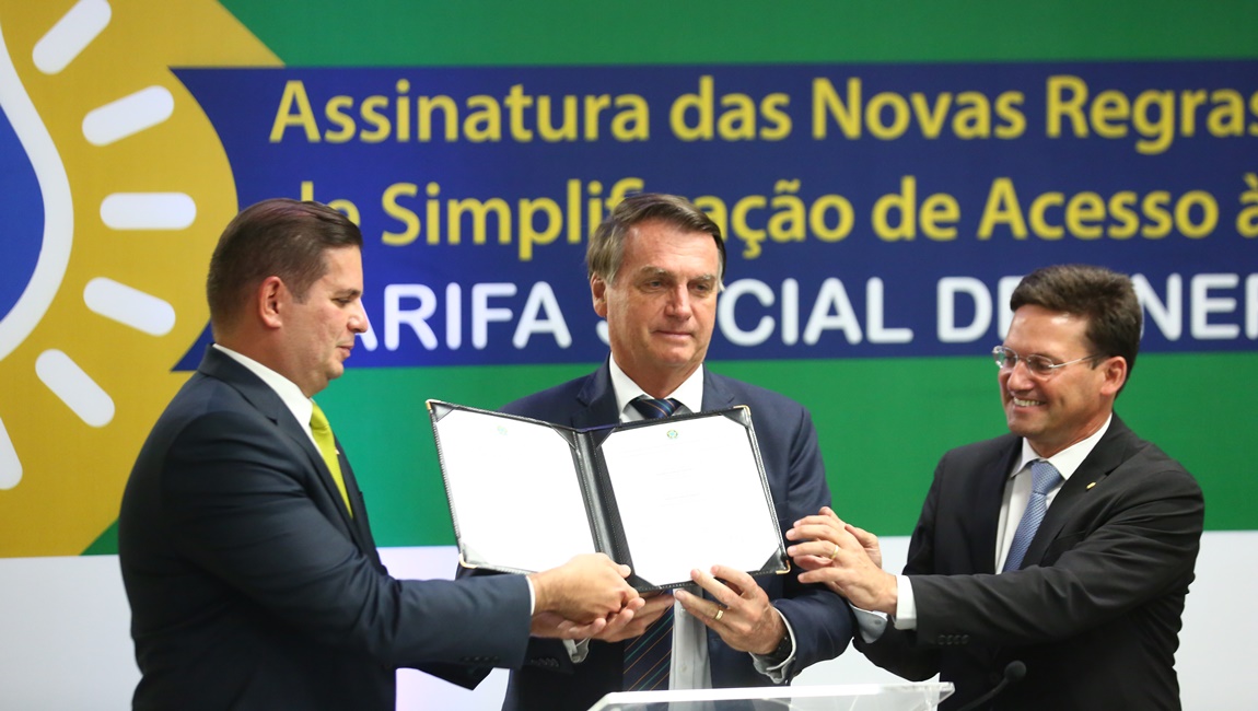 O diretor-geral da ANEEL, André Pepitone, o presidente Jair Bolsonaro e o ministro da Cidadania, João Roma. Foto: Júlio Dutra/ Min. Cidadania