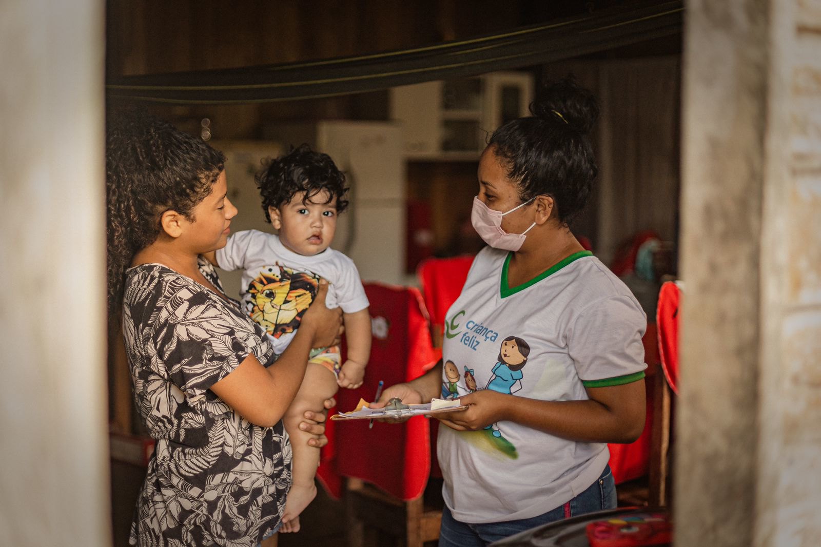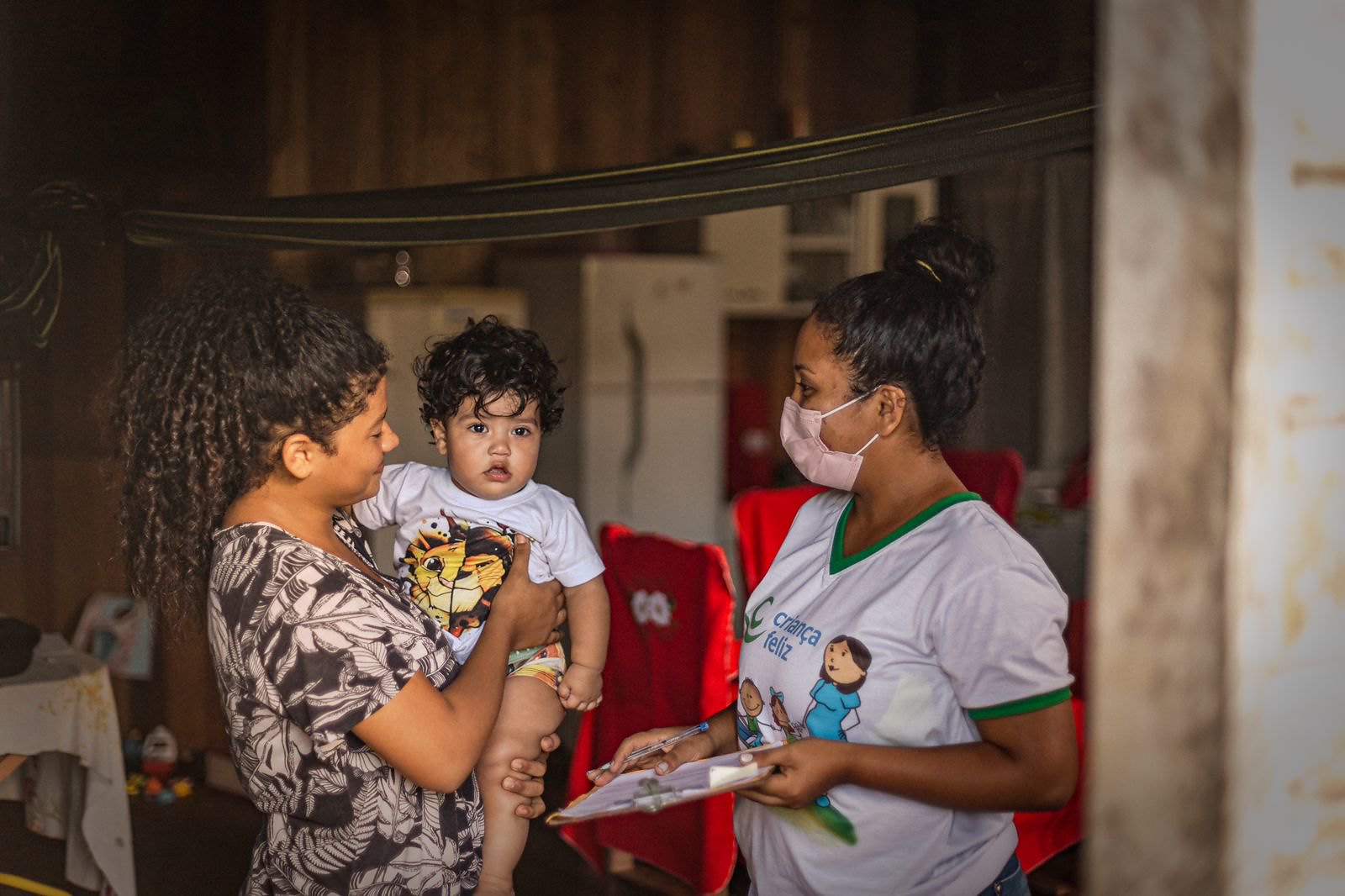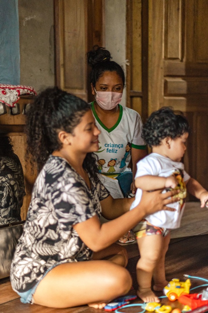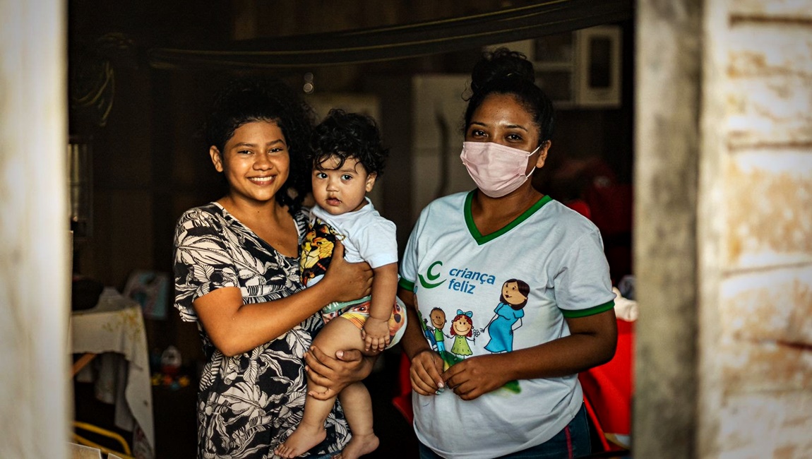 Carla, o filho Enzo e a visitadora do Criança Feliz Luane: parceria.